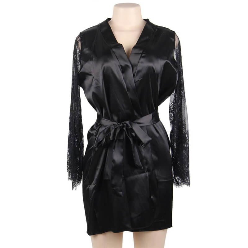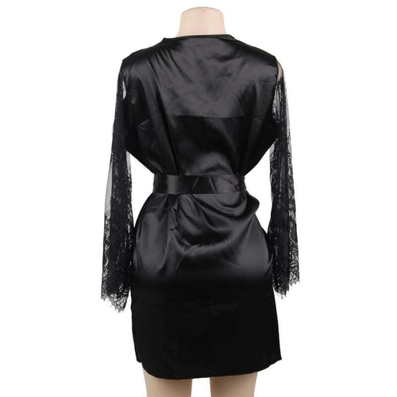 Beautiful satin elegance black robe with lace sleeves and satin black tie.